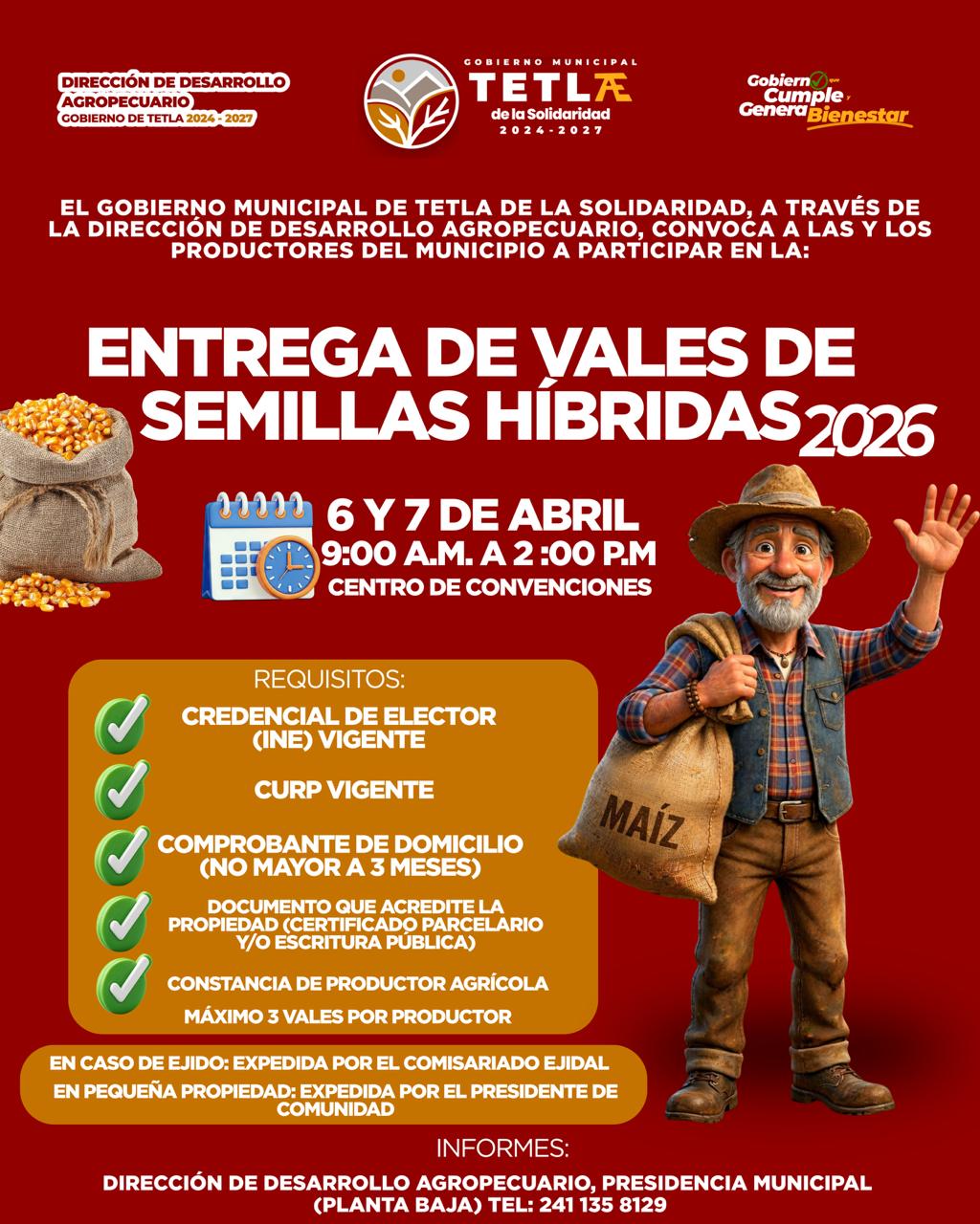 El Gobierno Municipal de Tetla de la Solidaridad, a través de la Dirección de Desarrollo Agropecuario, te invita a participar en la Entrega de Vales de Semillas Híbridas 2026.